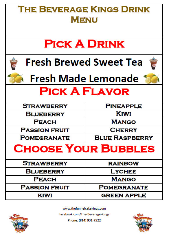 Welcome to central PA’s fastest growing and most talked about specialty non-alcoholic drinks made with a wide variety of flavors. At the Beverage Kings we brew our tea and make our lemonade daily. We currently offer over 200 different drinks to choose from.